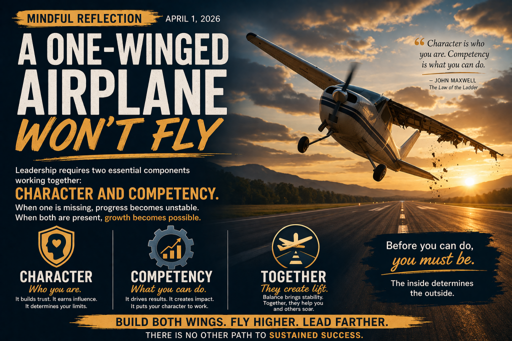 Mindful Reflection April 1, 2026 A One-Winged Airplane Won’t Fly An airplane with one wing flies about as well as a pig. I realize that statement isn’t technically precise, but the image makes the point. For an aircraft to fly—and to stay in the air—it must have balance. Both wings matter. Remove one, and gravity